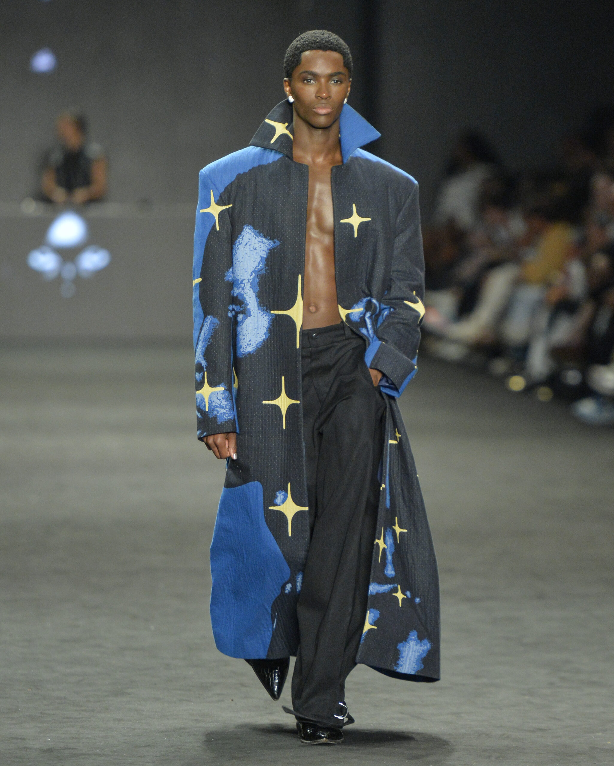 O preto dominou a cartela, pontuado por bordô, cinza, vermelho e azul. Nas estampas, figuras humanas pretas em movimento ecoavam a cultura de baile e a força de resistência que marca o ballroom norte-americano.